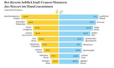 Ich weiß, Produkt-PR kann ganz schön schwierig sein. Aber die Grafik, die ich eben im Pressebereich bei Procter & Gamble fand (zum Vergrößern klicken, pdf hier), erstaunte mich schon. Was will uns die P&G-PR damit sagen, dass Frauen auf durchtrainierte Männerkörper und Männer auf sinnliche Münder stehen? Und was hat das mit P&G zu tun?