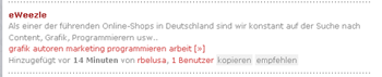 Hinter eWeezle steht übrigens ProMarkt – und der Mr. Wong-User, der das abgespeichert hat, Ralf Belusa (Blog), ist Mitglied der Geschäftsleitung der Promarkt Online GmbH, der hier offensichtlich Social Bookmarking zum Recruiting einsetzt und Leute gewinnen will, die den Onlineshop technisch weiterentwickeln und Content produzieren. Dass sich solche Leute in Social Bookmarking-Diensten tummeln, liegt nahe.