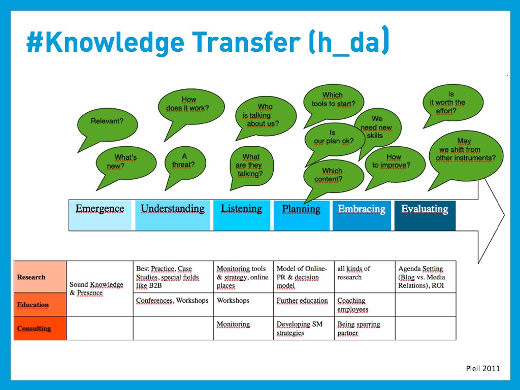 Aus Sicht des Akademikers hat diese Matrix folgenden Charme: Ich kann zu jeder Frage bzw. zu jeder Innovationsphase überlegen, inwieweit man aus Hochschulsicht zur Beantwortung beitragen kann. Klar wird, dass ich im Sinne der Aktionsforschung einen engen Zusammenhang zwischen Forschung, Lehre und Beratung sehe. Konkretes Beispiel: Die von meinen Studenten im Unterricht erarbeiteten Fallbeispiele von Early Adopters helfen anderen Unternehmen, wenn es um grundsätzliches Verständnis geht. Vermitteln lässt sich dies nicht nur in einer Publikation, sondern kann ebenso wie eine Social Media Literacy dann u.a. in Workshops oder Weiterbildungen wie Zukunft Online-PR diskutiert werden. Das Fünf-Ebenen-Modell zur Planung der Online-PR ist dann logischerweise ein akademischer Beitrag zu Konzeption. Sicher sind noch ganz andere Beiträge der Wissenschaft denkbar, in die Matrix eingetragen sind hier erst mal nur Darmstädter Beispiele.
